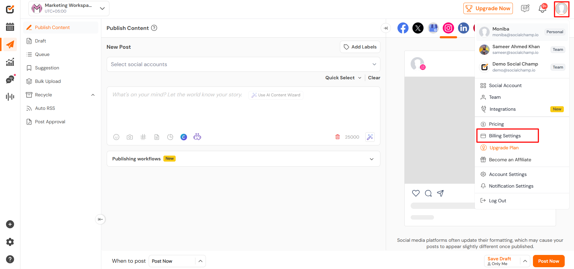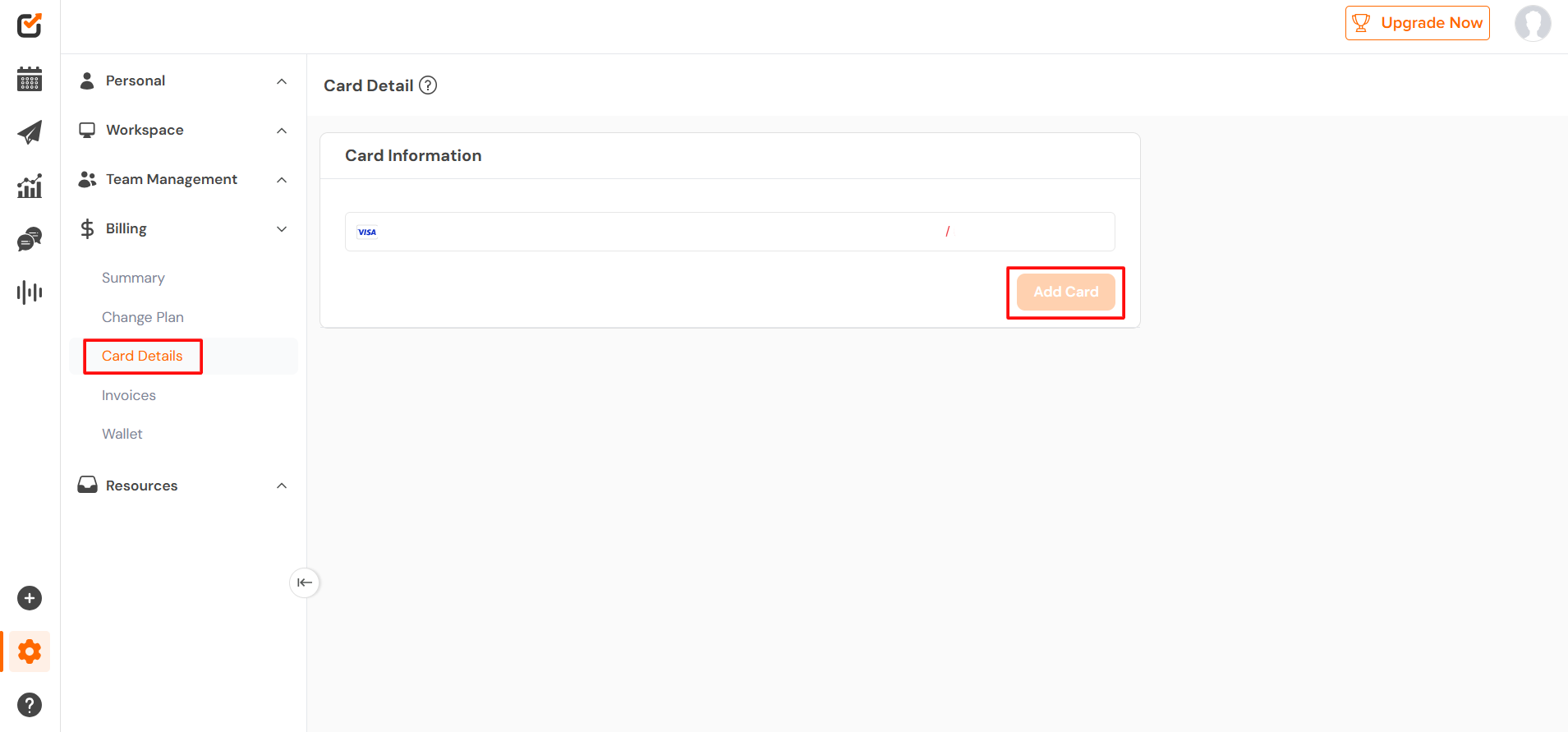 You can easily add your payment card details to Social Champ without activating any subscription. Just follow the steps below: