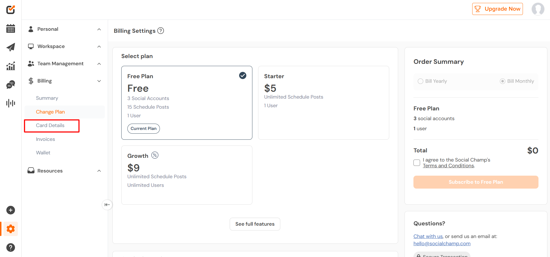 Great work! Your card is now added to your Social Champ account without subscribing to a plan.