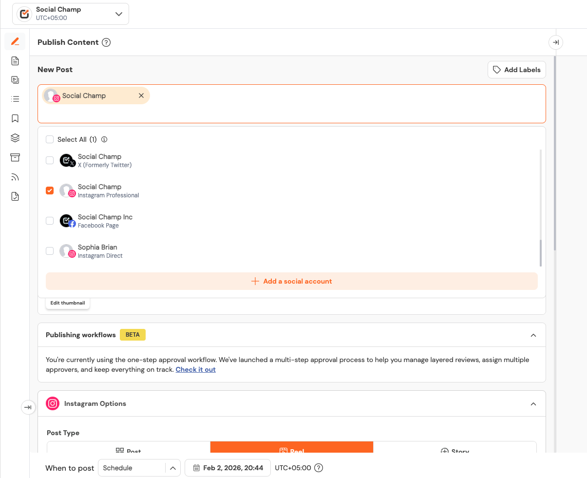 - After logging into your Social Champ account, you will land on the Content Dashboard by default. Navigate your cursor to the top drop-down and select your Instagram Business account connected with Social Champ (Instagram Direct Posting).