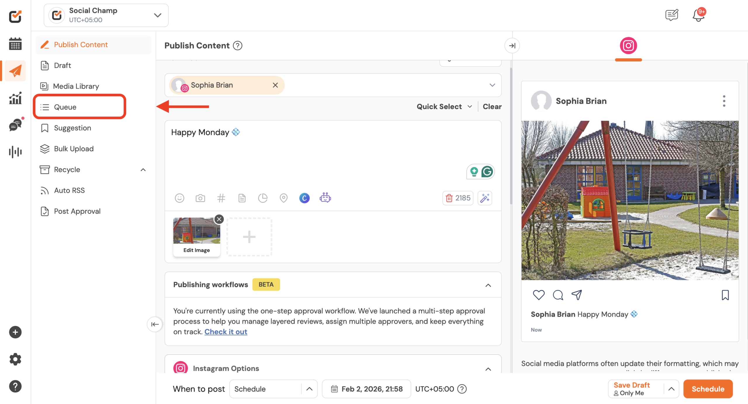 Sign in to your Social Champ account and navigate to the Queue option from the left-hand menu.
