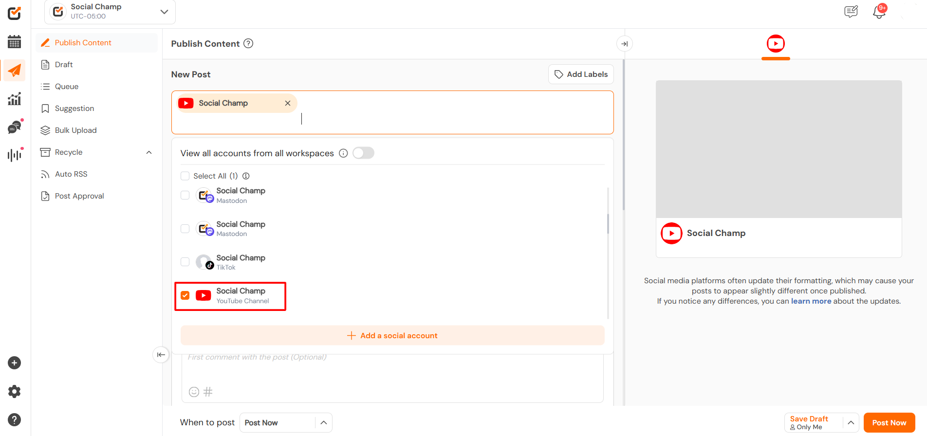 - As soon as you log in to your Social Champ account, you will land on the Publish content dashboard. From the drop-down menu, select your YouTube channel.