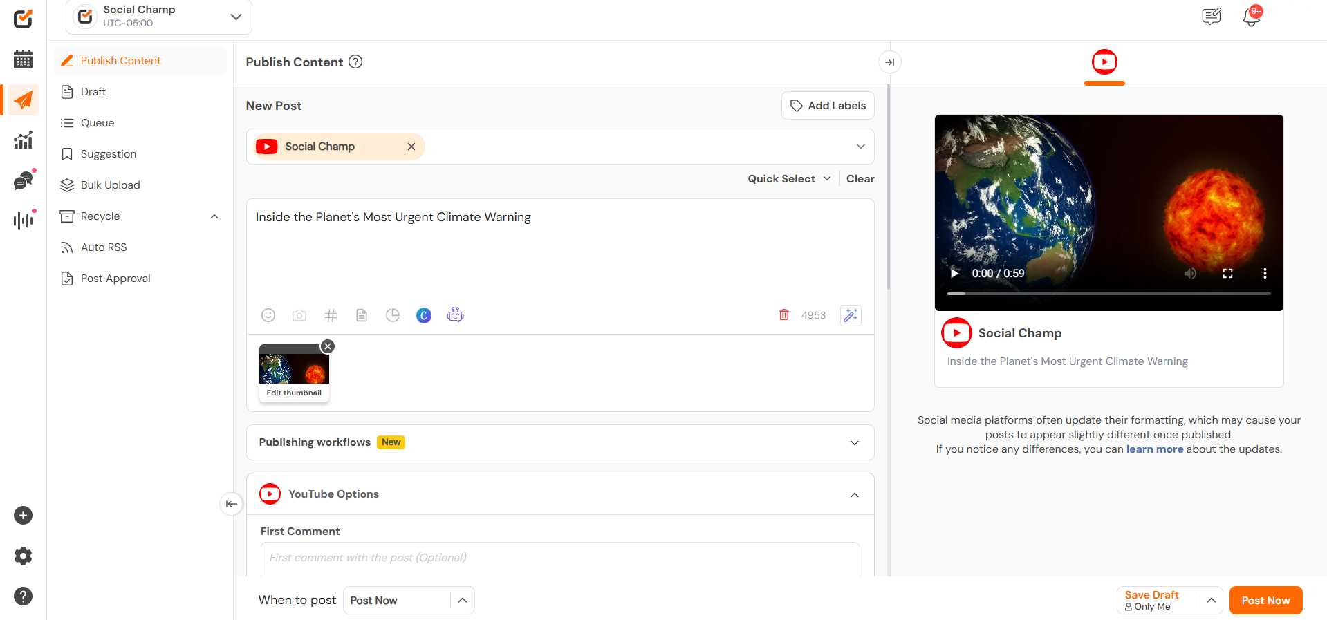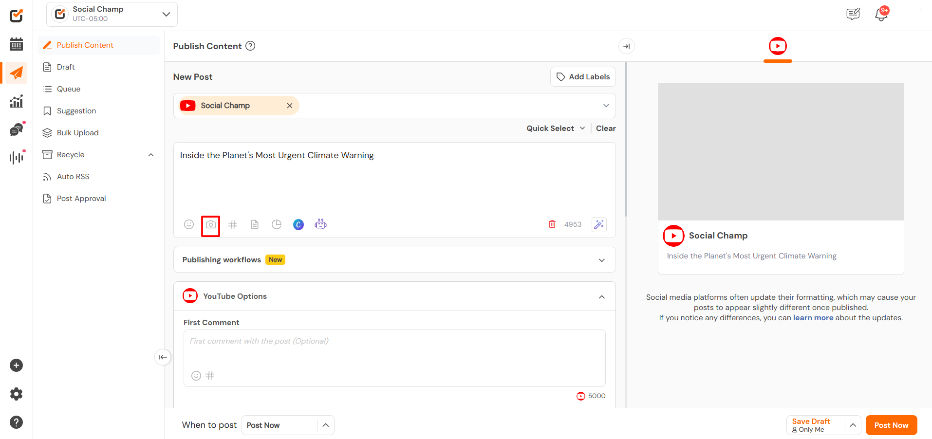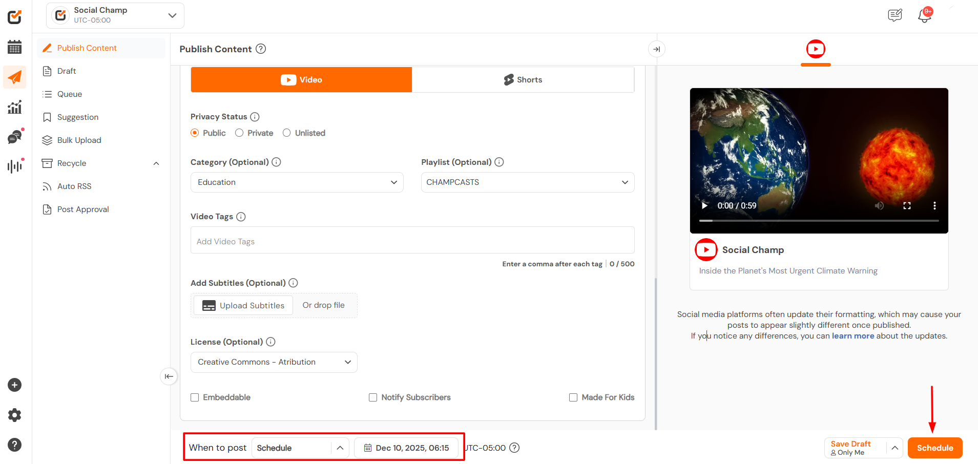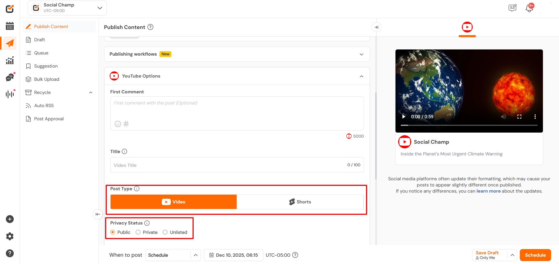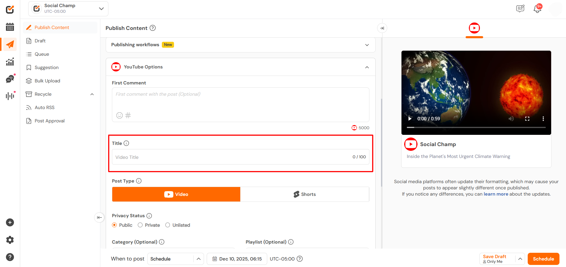 Enhance your content strategy and engage your audience with YouTube video scheduling. Follow this step-by-step guide to schedule videos on your YouTube channel using Social Champ seamlessly.