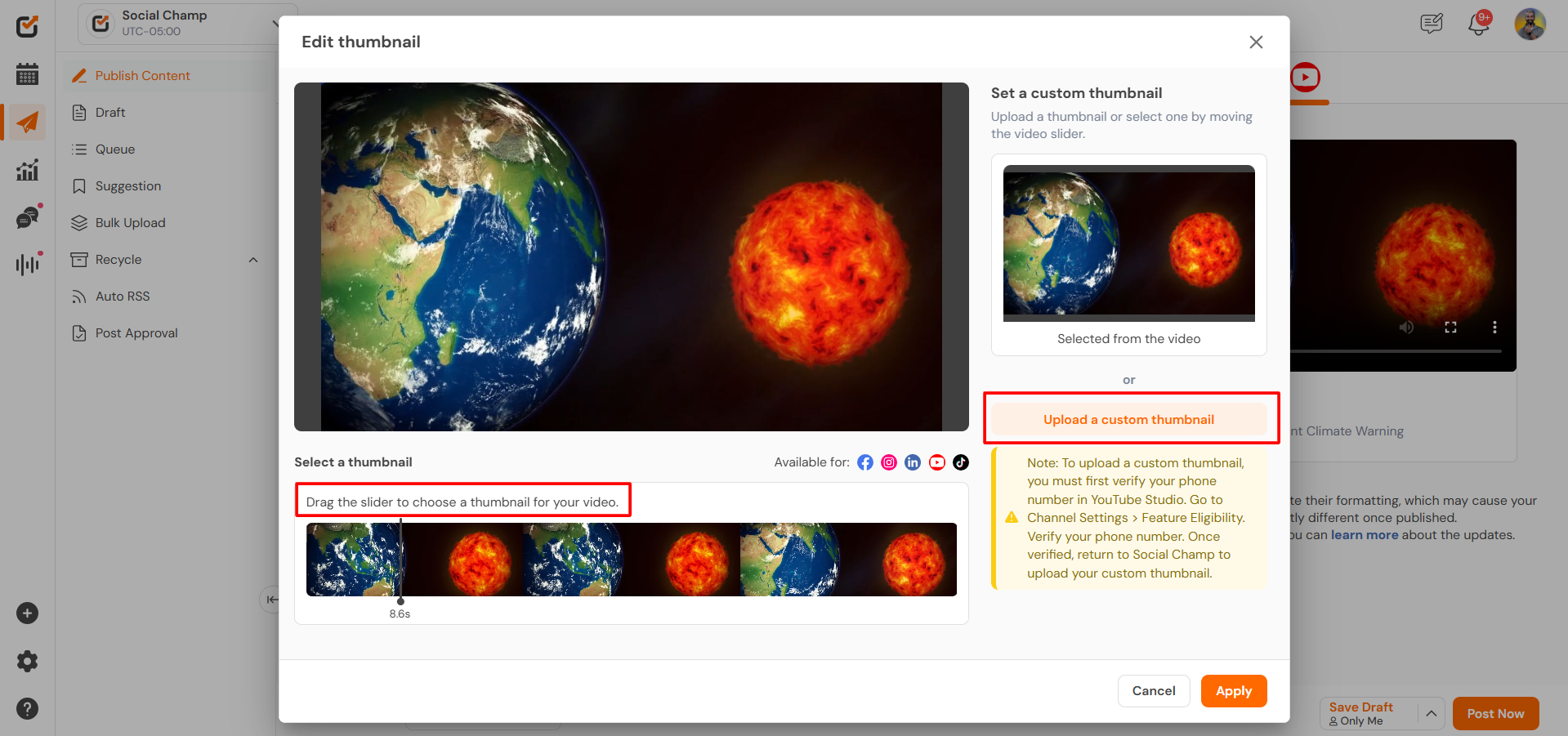 - Clicking on the ”Edit Thumbnail”, you can also edit the video’s thumbnail. Thumbnails can be chosen from the video frame, or you can also upload Custom thumbnails. Once done, click on ”Apply Thumbnail”.